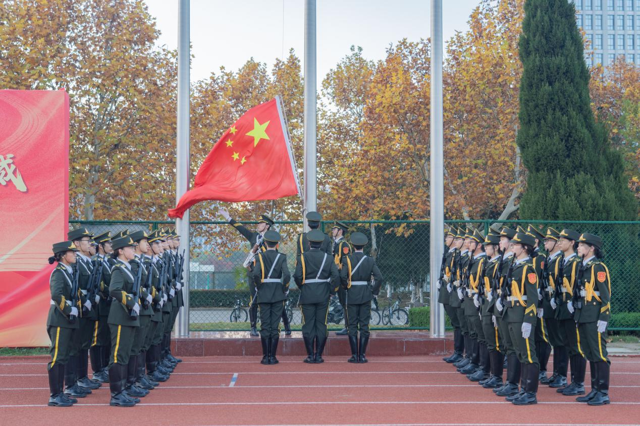 迎着初阳,升旗仪式正式开始。英姿飒爽的国旗护卫队迈着铿锵的步伐,护送着五星红旗,走上升旗台。伴随着《义勇军进行曲》振奋人心的旋律,五星红旗在第一抹晨曦中冉冉升起、迎风飘扬。全体师生精神饱满、庄严肃立,向国旗行注目礼,并以昂扬姿态高唱国歌,表达对祖国的无限热爱、崇高敬意和深深祝福。