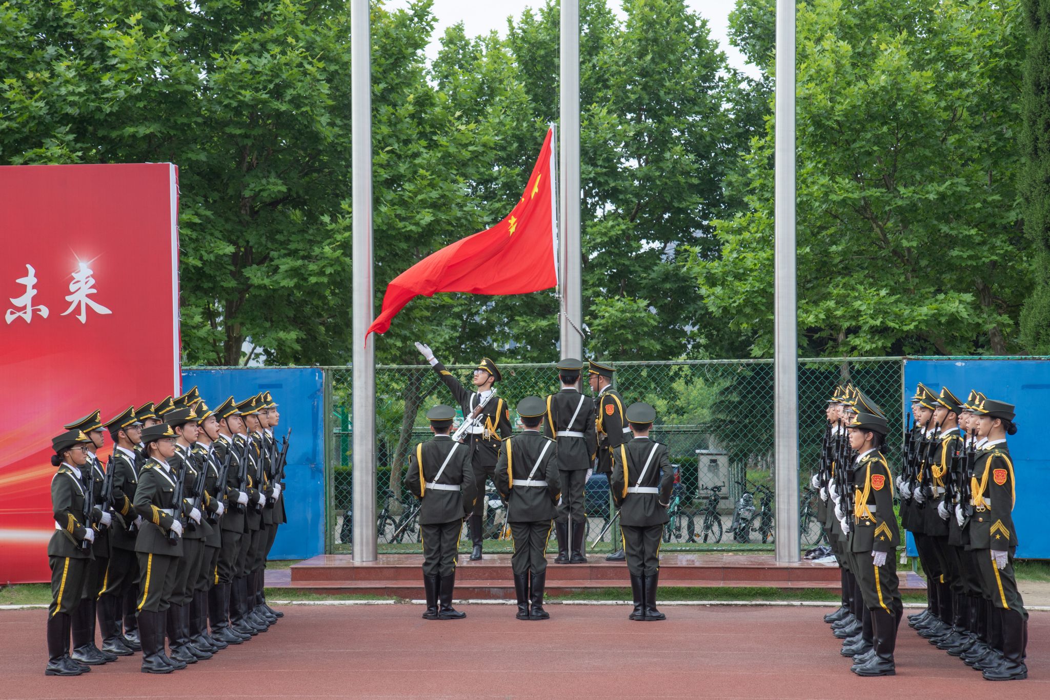 迎着初阳,升旗仪式正式开始。英姿飒爽的国旗护卫队迈着铿锵的步伐,护送着五星红旗,走上升旗台。伴随着《义勇军进行曲》振奋人心的旋律,五星红旗在第一抹晨曦中冉冉升起、迎风飘扬。全体师生精神饱满、庄严肃立,向国旗行注目礼,并以昂扬姿态高唱国歌,表达对祖国的无限热爱、崇高敬意和深深祝福。